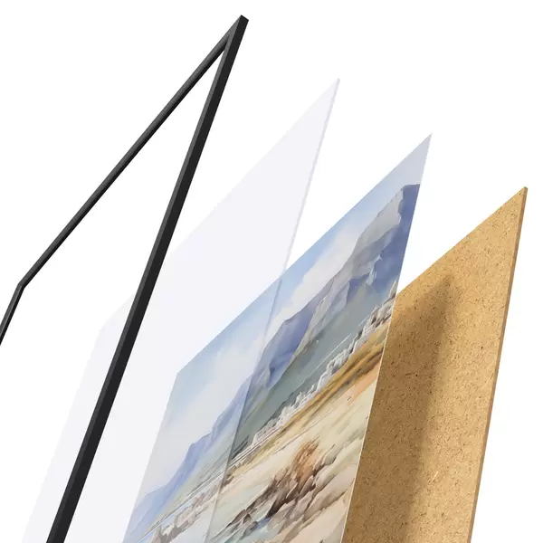 Das Poster besteht aus einem Rahmen, Plexiglas, einem gedruckten Bild und einer Rückwand aus Spanplatten. Dank der Halterungen auf der Rückseite kann das Poster sofort an die Wand gehängt werden.