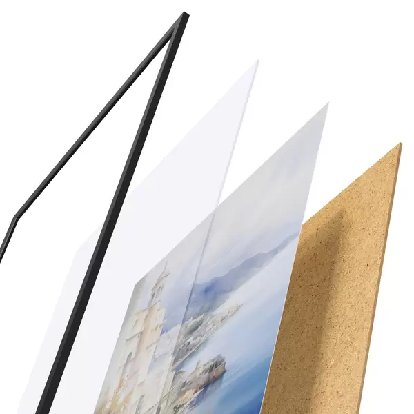 Das Poster besteht aus einem Rahmen, Plexiglas, einem gedruckten Bild und einer Rückwand aus Spanplatten. Dank der Halterungen auf der Rückseite kann das Poster sofort an die Wand gehängt werden.