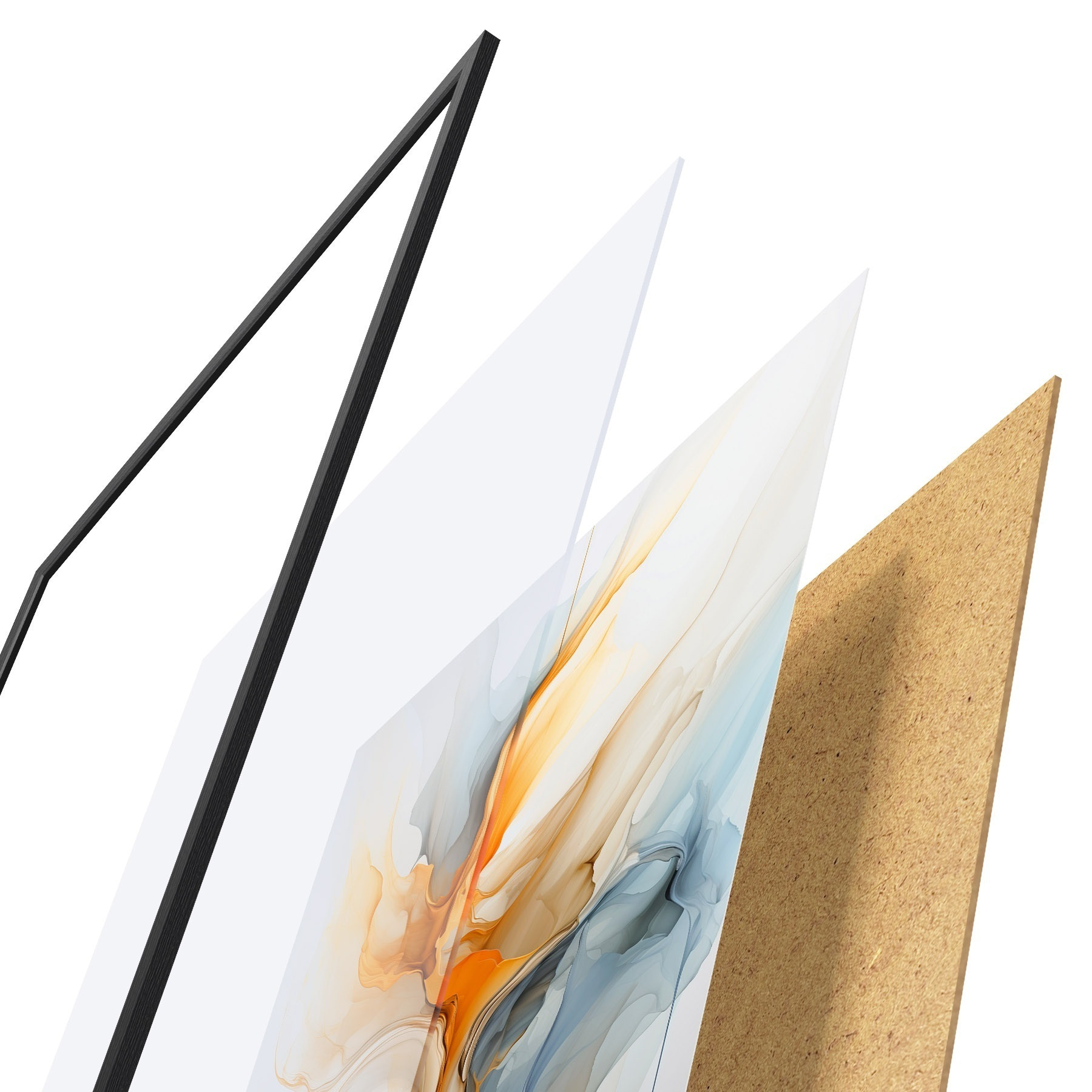 Das Poster besteht aus einem Rahmen, Plexiglas, einem gedruckten Bild und einer Rückwand aus Spanplatten. Dank der Halterungen auf der Rückseite kann das Poster sofort an die Wand gehängt werden.