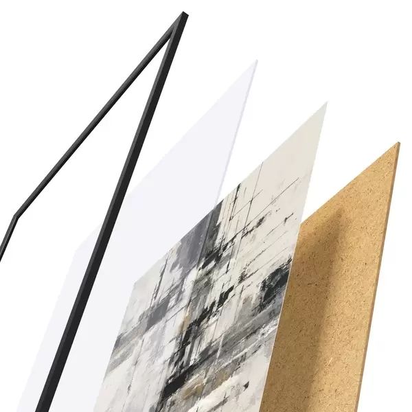 Das Poster besteht aus einem Rahmen, Plexiglas, einem gedruckten Bild und einer Rückwand aus Spanplatten. Dank der Halterungen auf der Rückseite kann das Poster sofort an die Wand gehängt werden.