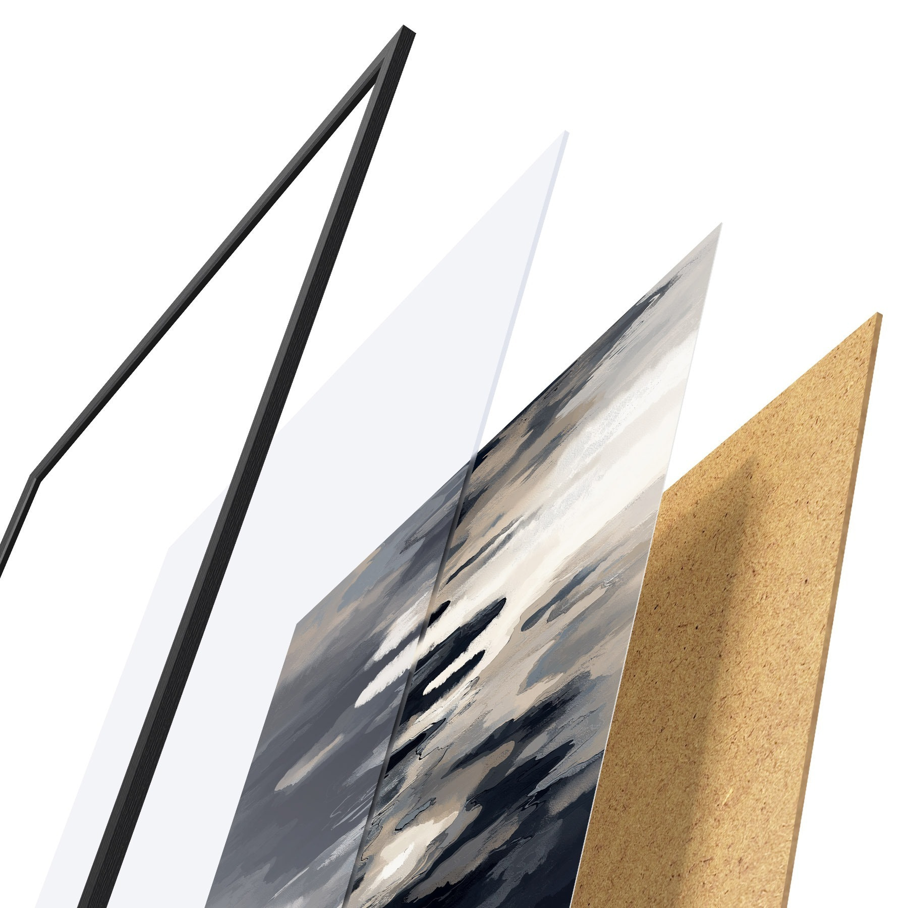 Das Poster besteht aus einem Rahmen, Plexiglas, einem gedruckten Bild und einer Rückwand aus Spanplatten. Dank der Halterungen auf der Rückseite kann das Poster sofort an die Wand gehängt werden.