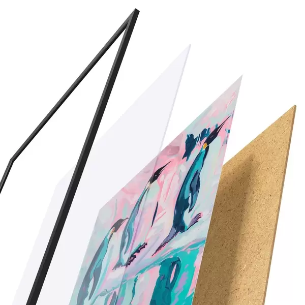 Das Poster besteht aus einem Rahmen, Plexiglas, einem gedruckten Bild und einer Rückwand aus Spanplatten. Dank der Halterungen auf der Rückseite kann das Poster sofort an die Wand gehängt werden.