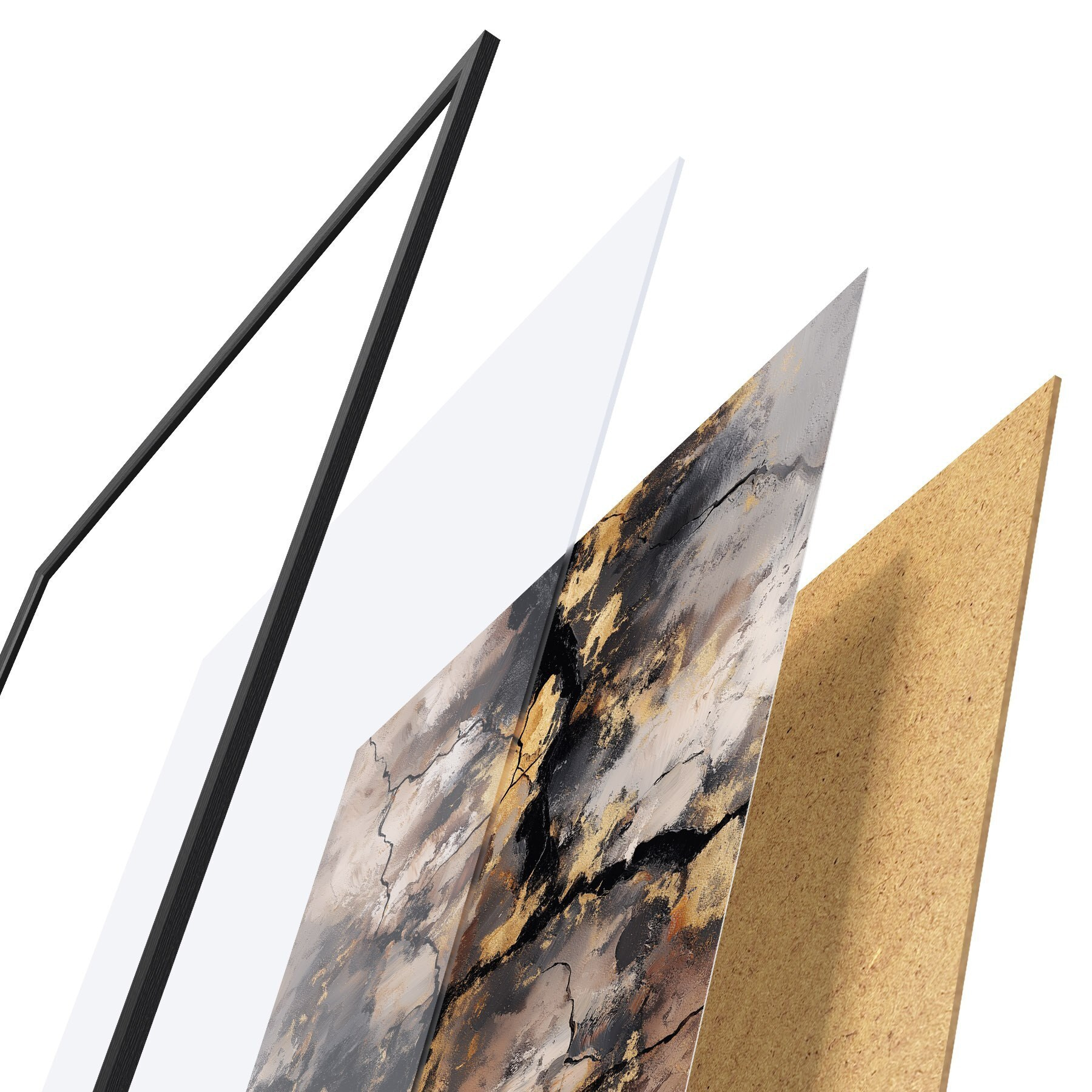 Das Poster besteht aus einem Rahmen, Plexiglas, einem gedruckten Bild und einer Rückwand aus Spanplatten. Dank der Halterungen auf der Rückseite kann das Poster sofort an die Wand gehängt werden.
