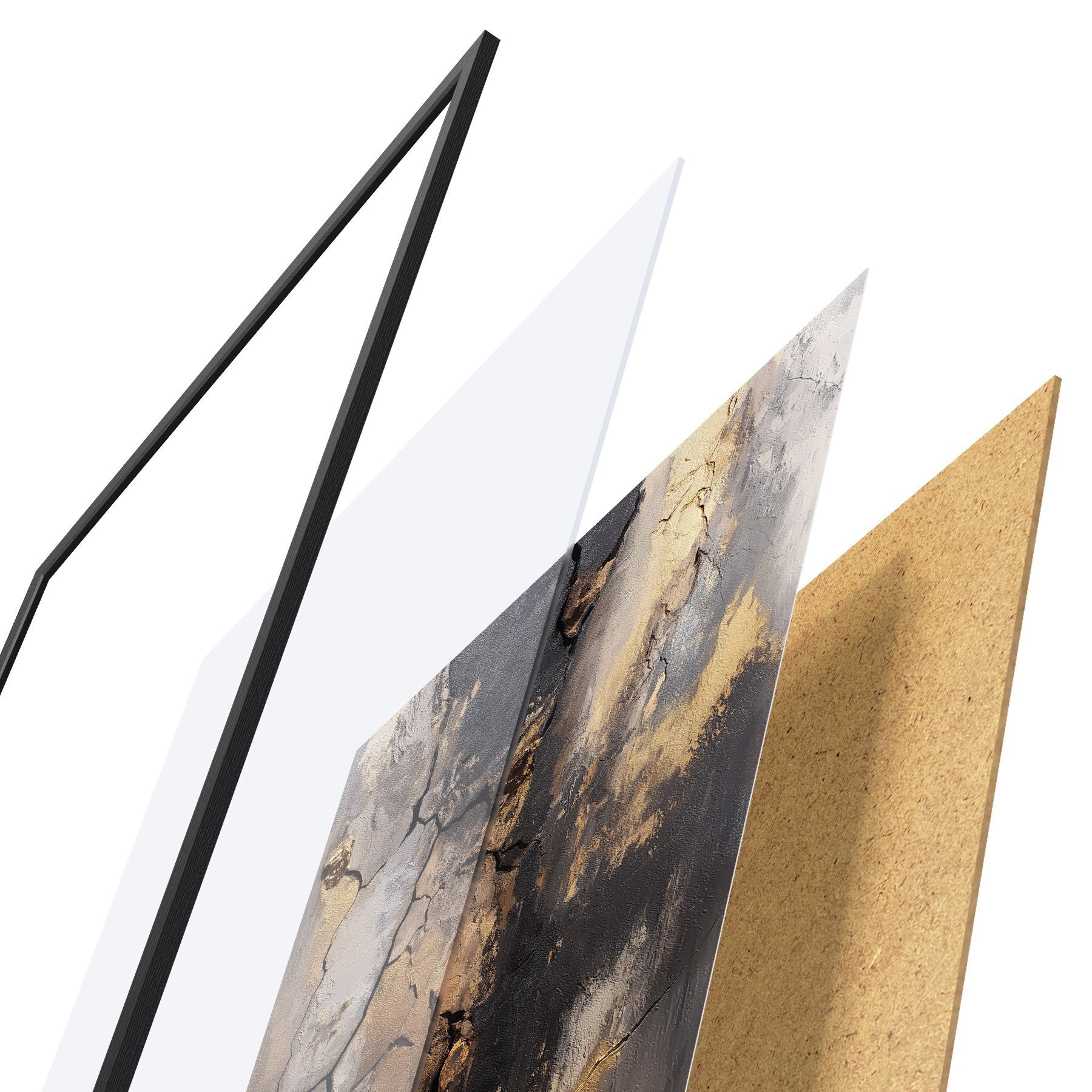Das Poster besteht aus einem Rahmen, Plexiglas, einem gedruckten Bild und einer Rückwand aus Spanplatten. Dank der Halterungen auf der Rückseite kann das Poster sofort an die Wand gehängt werden.