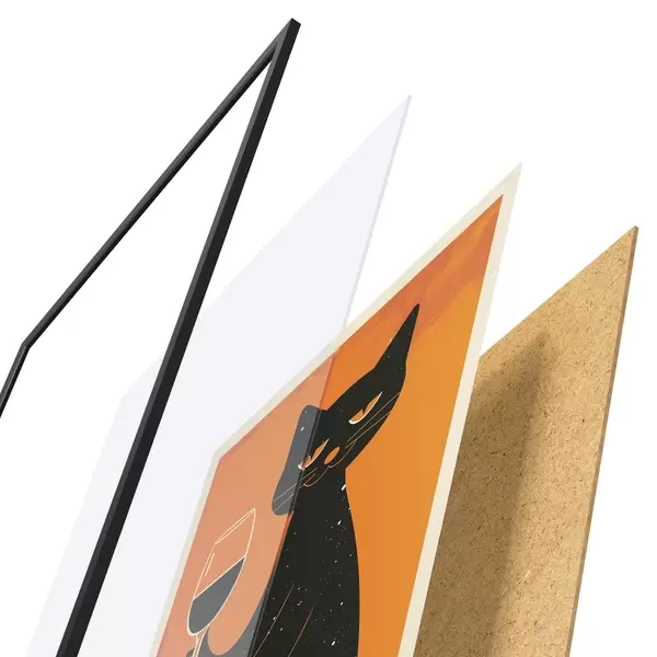 Das Poster besteht aus einem Rahmen, Plexiglas, einem gedruckten Bild und einer Rückwand aus Spanplatten. Dank der Halterungen auf der Rückseite kann das Poster sofort an die Wand gehängt werden.
