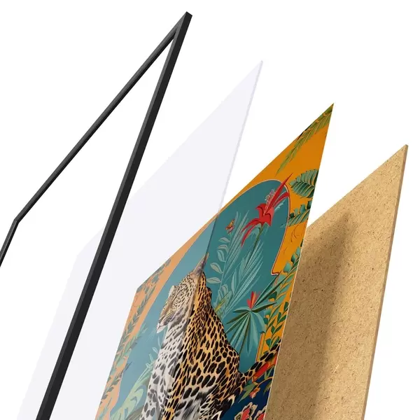 Das Poster besteht aus einem Rahmen, Plexiglas, einem gedruckten Bild und einer Rückwand aus Spanplatten. Dank der Halterungen auf der Rückseite kann das Poster sofort an die Wand gehängt werden.