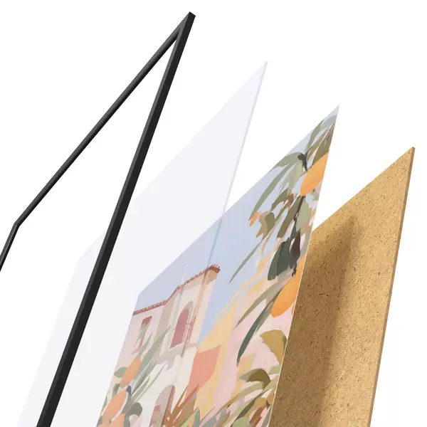 Das Poster besteht aus einem Rahmen, Plexiglas, einem gedruckten Bild und einer Rückwand aus Spanplatten. Dank der Halterungen auf der Rückseite kann das Poster sofort an die Wand gehängt werden.