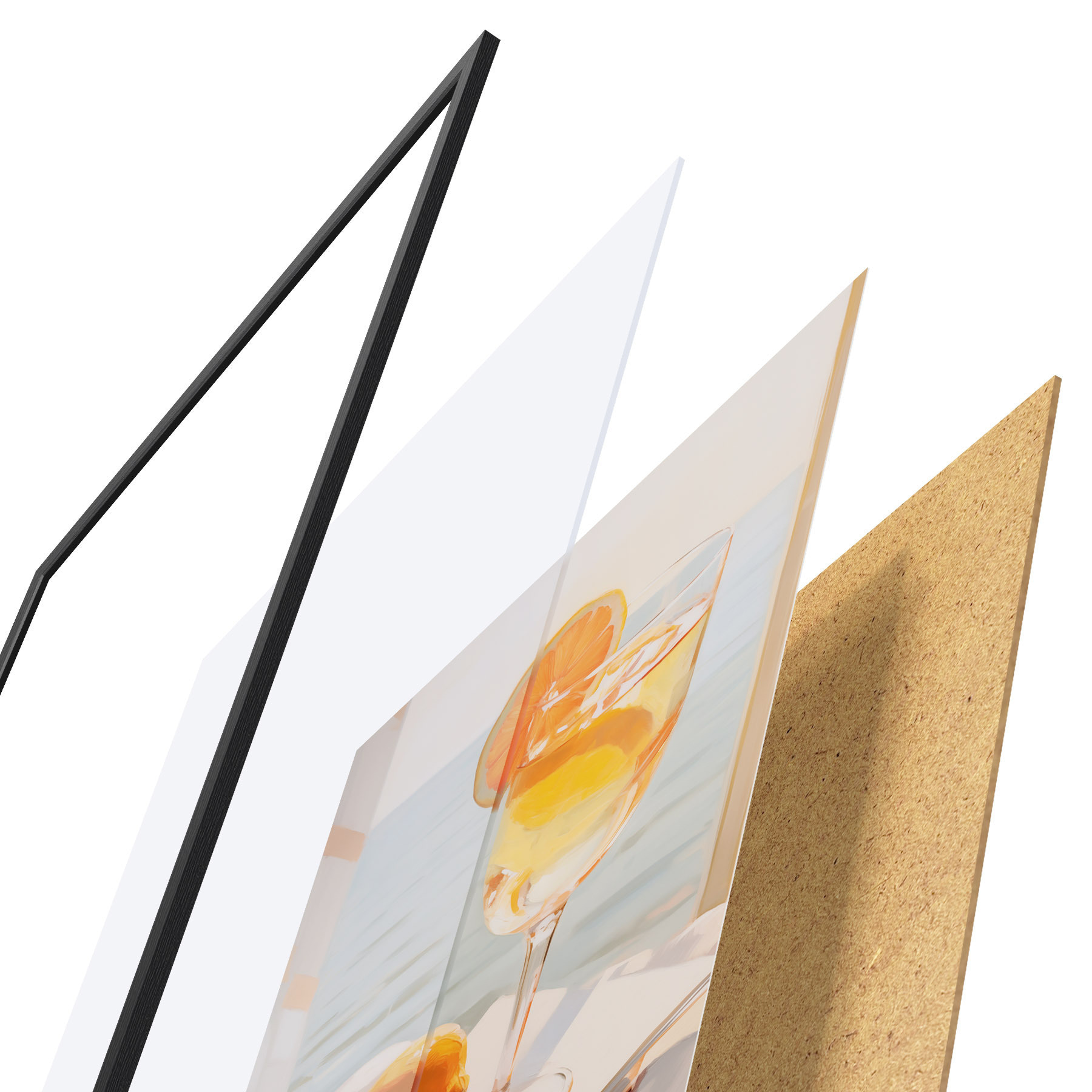Das Poster besteht aus einem Rahmen, Plexiglas, einem gedruckten Bild und einer Rückwand aus Spanplatten. Dank der Halterungen auf der Rückseite kann das Poster sofort an die Wand gehängt werden.