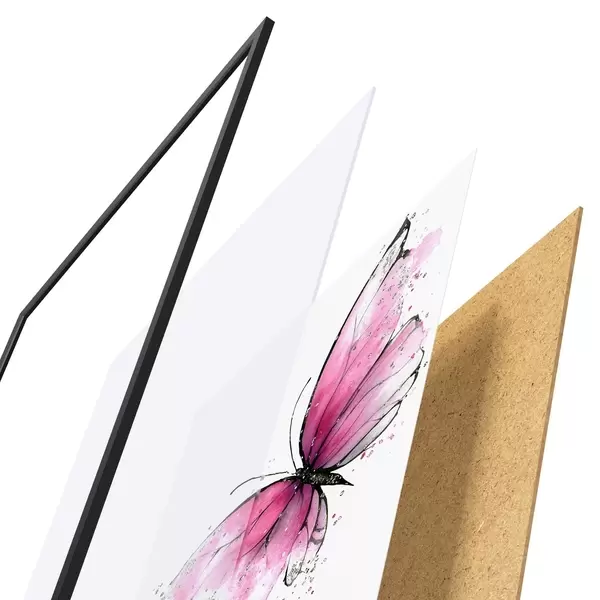 Das Poster besteht aus einem Rahmen, Plexiglas, einem gedruckten Bild und einer Rückwand aus Spanplatten. Dank der Halterungen auf der Rückseite kann das Poster sofort an die Wand gehängt werden.