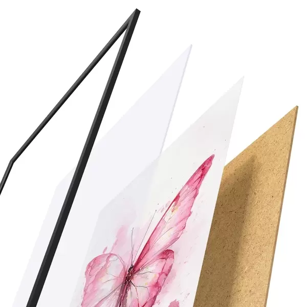 Das Poster besteht aus einem Rahmen, Plexiglas, einem gedruckten Bild und einer Rückwand aus Spanplatten. Dank der Halterungen auf der Rückseite kann das Poster sofort an die Wand gehängt werden.