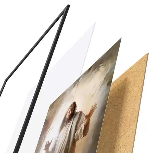 Das Poster besteht aus einem Rahmen, Plexiglas, einem gedruckten Bild und einer Rückwand aus Spanplatten. Dank der Halterungen auf der Rückseite kann das Poster sofort an die Wand gehängt werden.