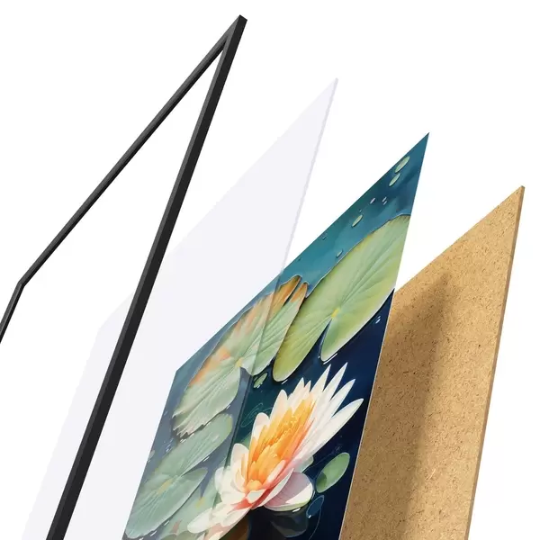 Das Poster besteht aus einem Rahmen, Plexiglas, einem gedruckten Bild und einer Rückwand aus Spanplatten. Dank der Halterungen auf der Rückseite kann das Poster sofort an die Wand gehängt werden.