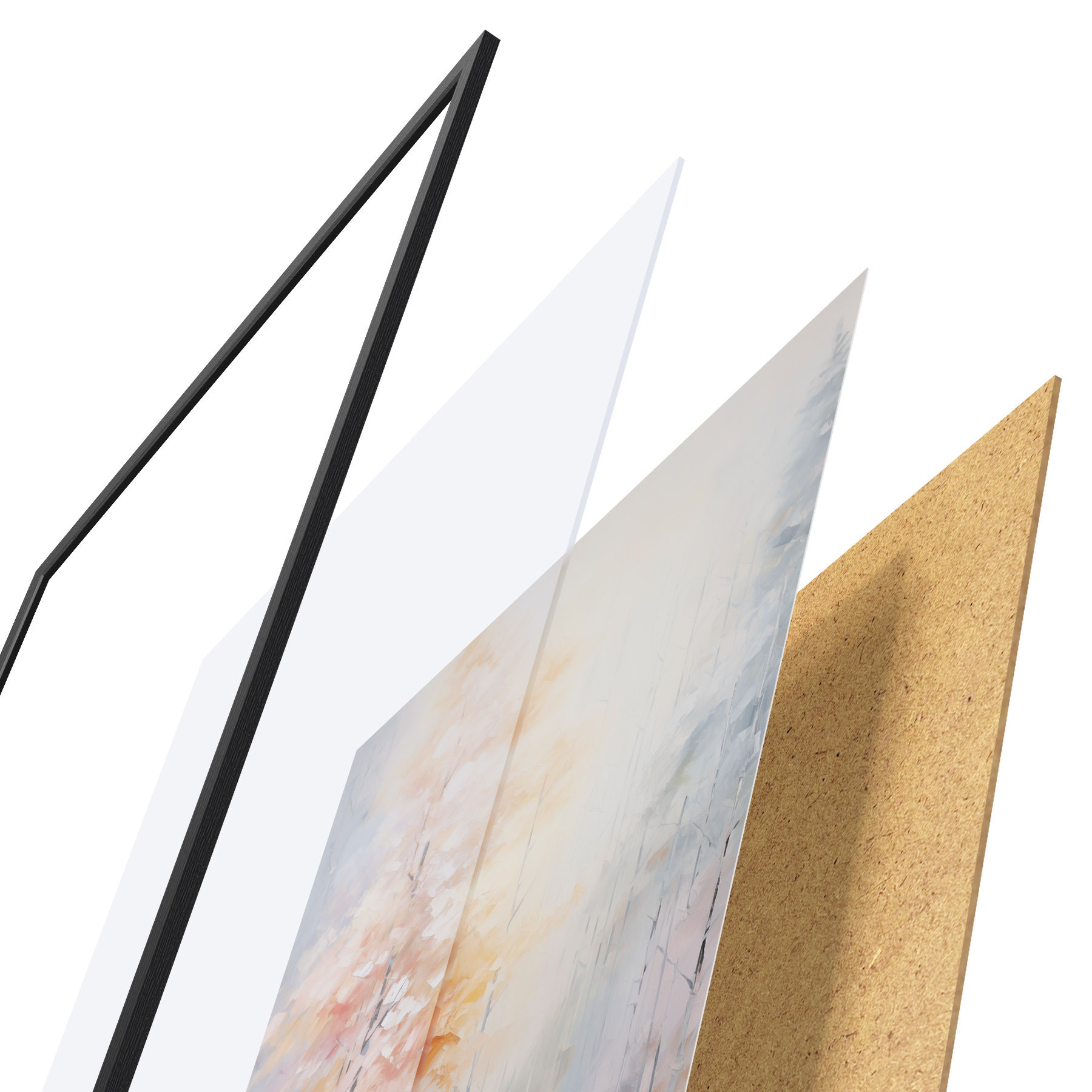 Das Poster besteht aus einem Rahmen, Plexiglas, einem gedruckten Bild und einer Rückwand aus Spanplatten. Dank der Halterungen auf der Rückseite kann das Poster sofort an die Wand gehängt werden.