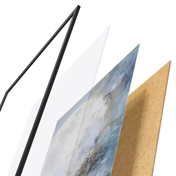 Das Poster besteht aus einem Rahmen, Plexiglas, einem gedruckten Bild und einer Rückwand aus Spanplatten. Dank der Halterungen auf der Rückseite kann das Poster sofort an die Wand gehängt werden.