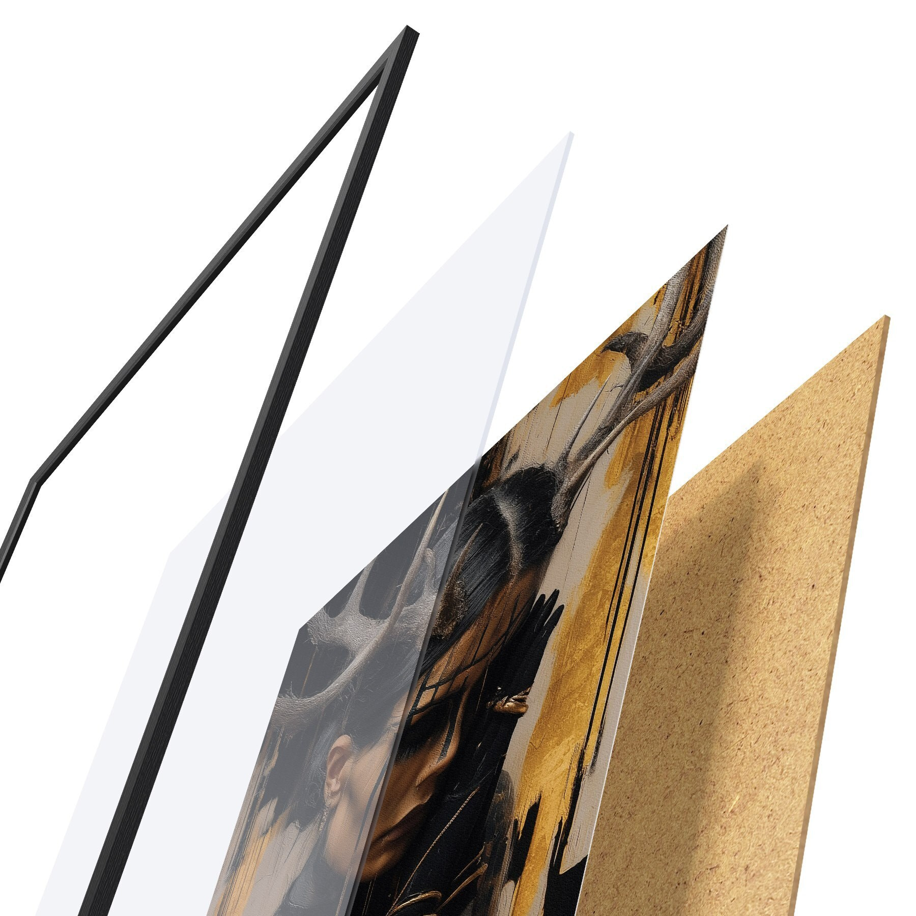 Das Poster besteht aus einem Rahmen, Plexiglas, einem gedruckten Bild und einer Rückwand aus Spanplatten. Dank der Halterungen auf der Rückseite kann das Poster sofort an die Wand gehängt werden.