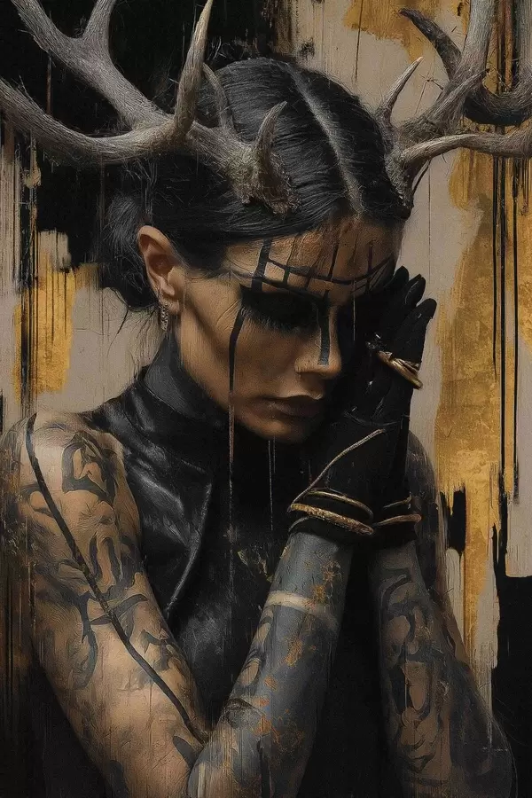 Poster Frau mit Hörnern in einem dunklen Look mit schwarzen Gesichtszügen Nr f46144