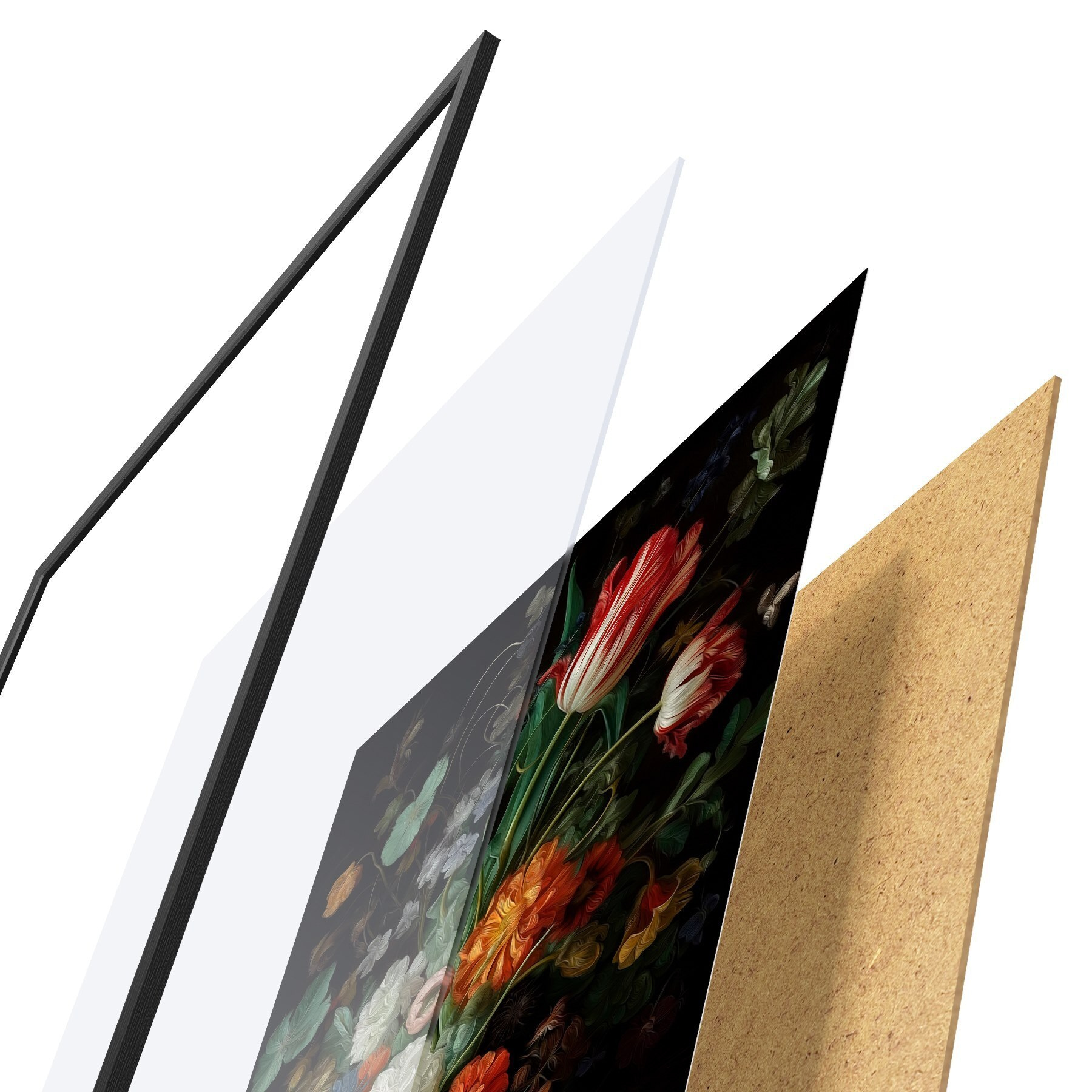 Das Poster besteht aus einem Rahmen, Plexiglas, einem gedruckten Bild und einer Rückwand aus Spanplatten. Dank der Halterungen auf der Rückseite kann das Poster sofort an die Wand gehängt werden.