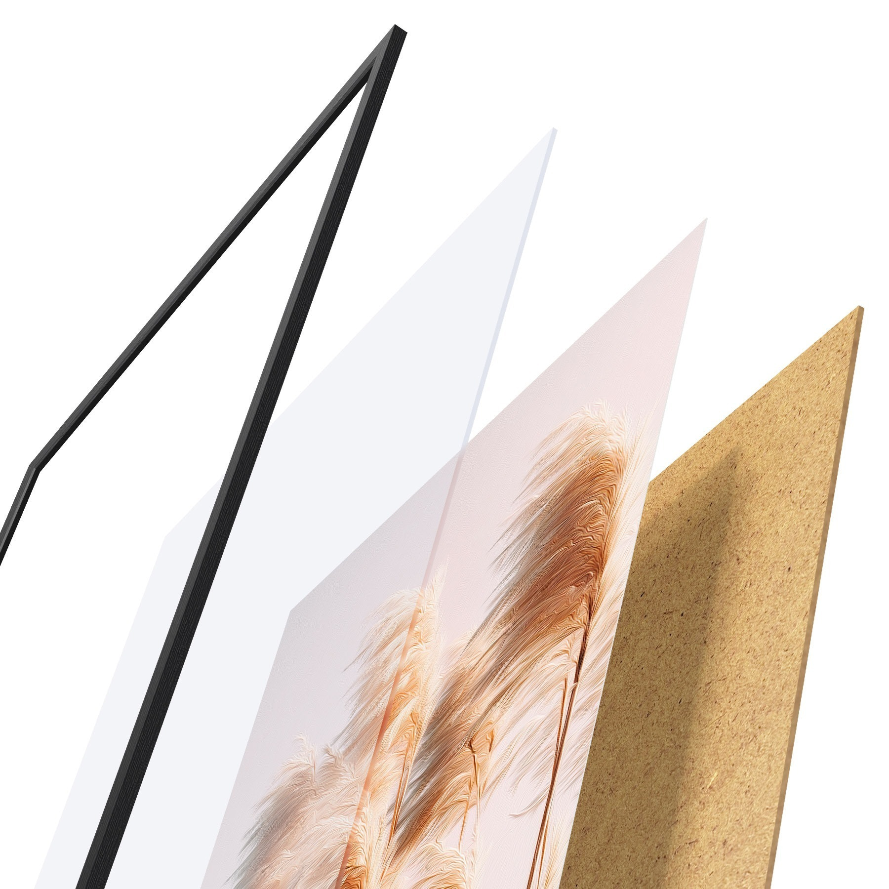 Das Poster besteht aus einem Rahmen, Plexiglas, einem gedruckten Bild und einer Rückwand aus Spanplatten. Dank der Halterungen auf der Rückseite kann das Poster sofort an die Wand gehängt werden.