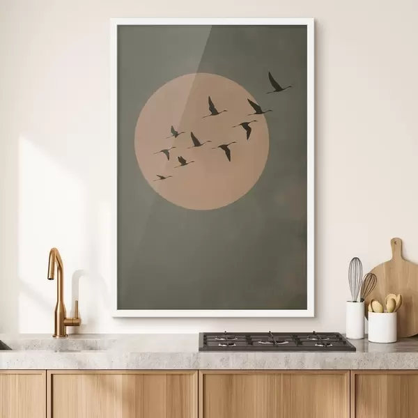 Poster Ein Vogelschwarm fliegt vor einem großen, warmen Mond Nr f46162