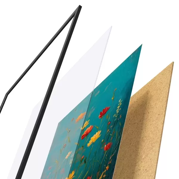 Das Poster besteht aus einem Rahmen, Plexiglas, einem gedruckten Bild und einer Rückwand aus Spanplatten. Dank der Halterungen auf der Rückseite kann das Poster sofort an die Wand gehängt werden.