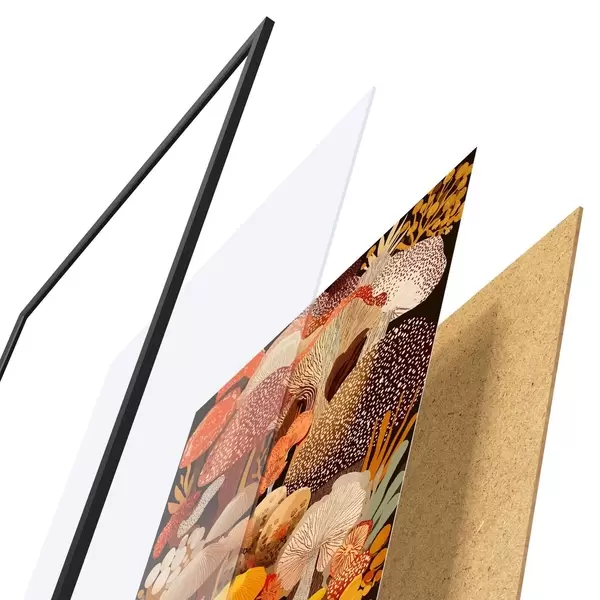 Das Poster besteht aus einem Rahmen, Plexiglas, einem gedruckten Bild und einer Rückwand aus Spanplatten. Dank der Halterungen auf der Rückseite kann das Poster sofort an die Wand gehängt werden.
