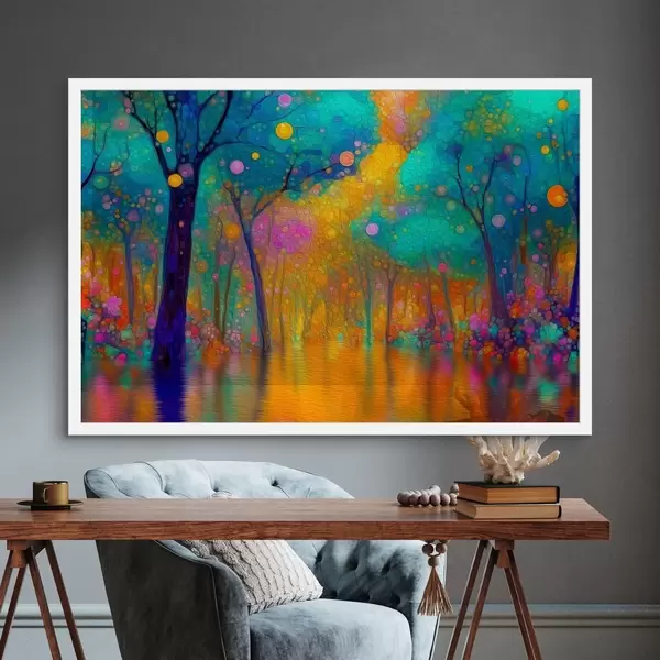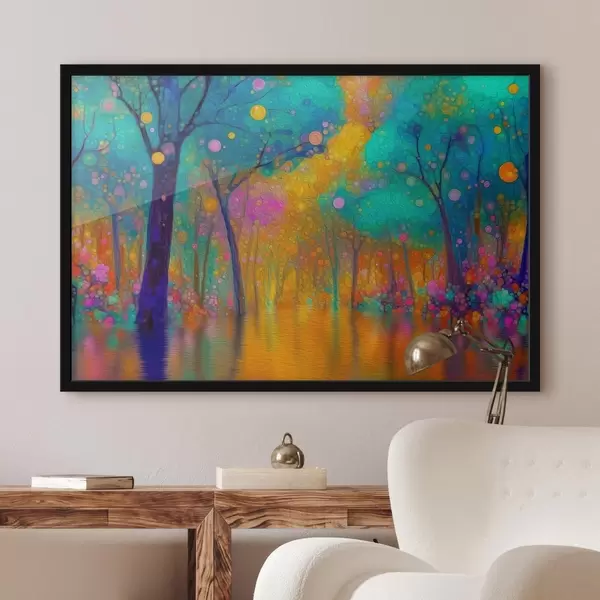 Poster Lebendiger Fantasiewald mit Spiegelungen im Wasser Nr f46171