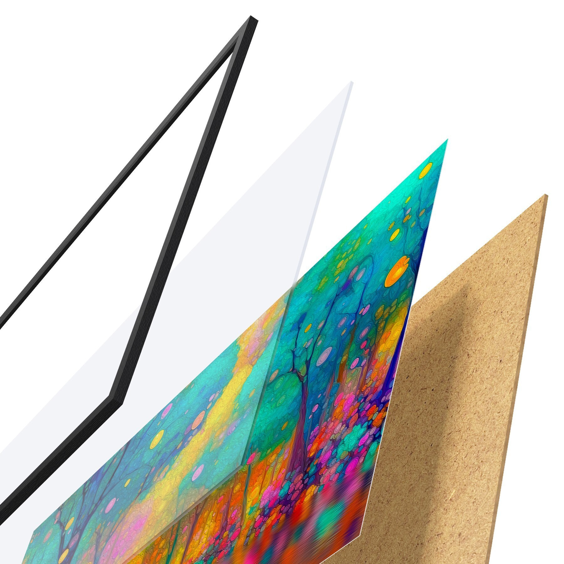 Das Poster besteht aus einem Rahmen, Plexiglas, einem gedruckten Bild und einer Rückwand aus Spanplatten. Dank der Halterungen auf der Rückseite kann das Poster sofort an die Wand gehängt werden.