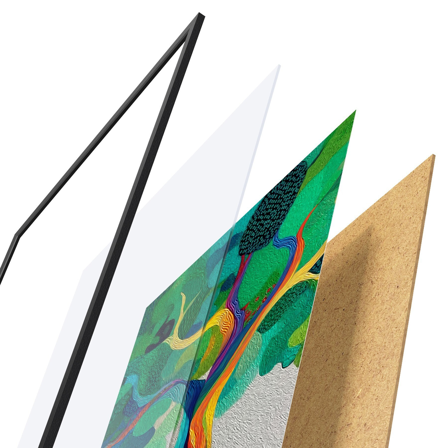 Das Poster besteht aus einem Rahmen, Plexiglas, einem gedruckten Bild und einer Rückwand aus Spanplatten. Dank der Halterungen auf der Rückseite kann das Poster sofort an die Wand gehängt werden.