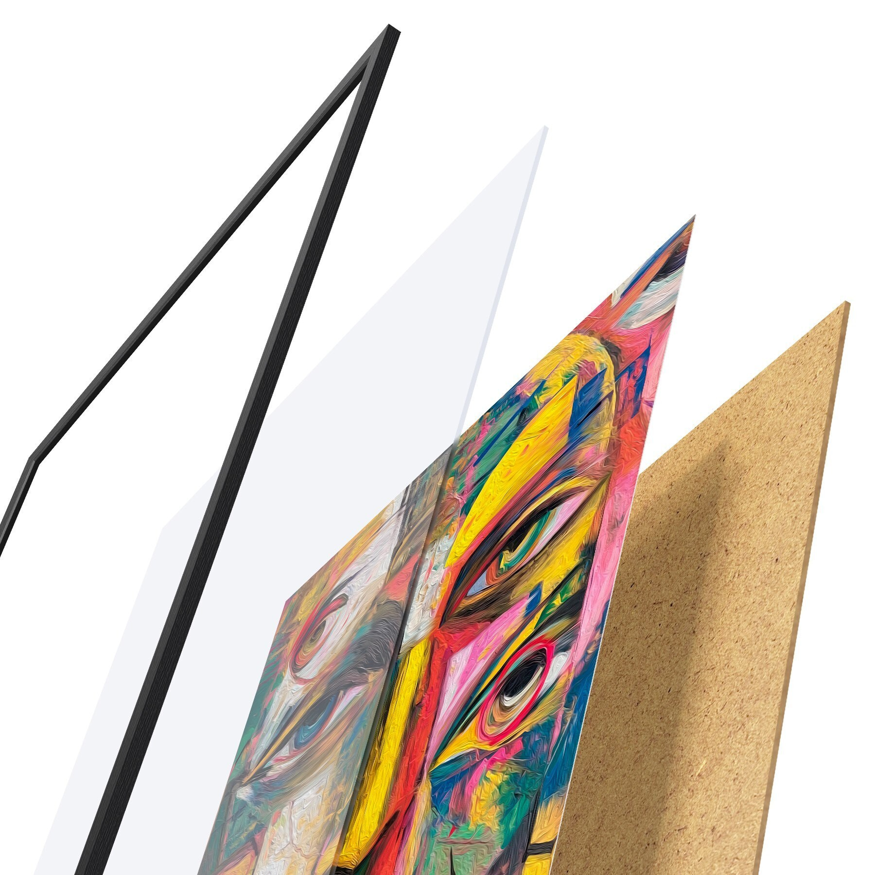 Das Poster besteht aus einem Rahmen, Plexiglas, einem gedruckten Bild und einer Rückwand aus Spanplatten. Dank der Halterungen auf der Rückseite kann das Poster sofort an die Wand gehängt werden.