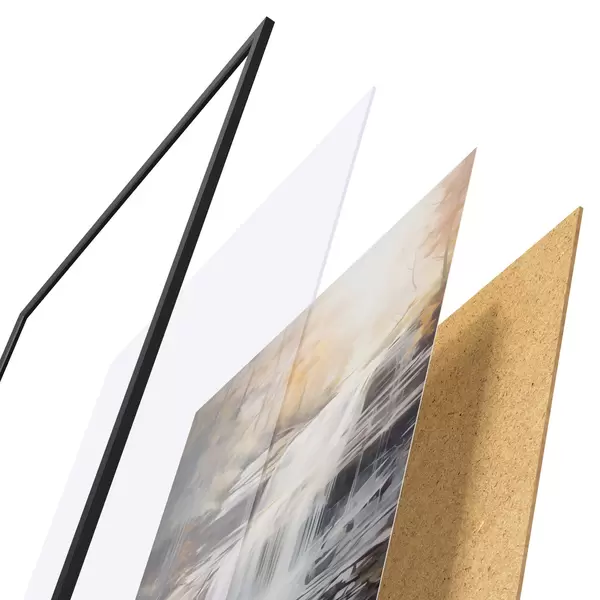 Das Poster besteht aus einem Rahmen, Plexiglas, einem gedruckten Bild und einer Rückwand aus Spanplatten. Dank der Halterungen auf der Rückseite kann das Poster sofort an die Wand gehängt werden.