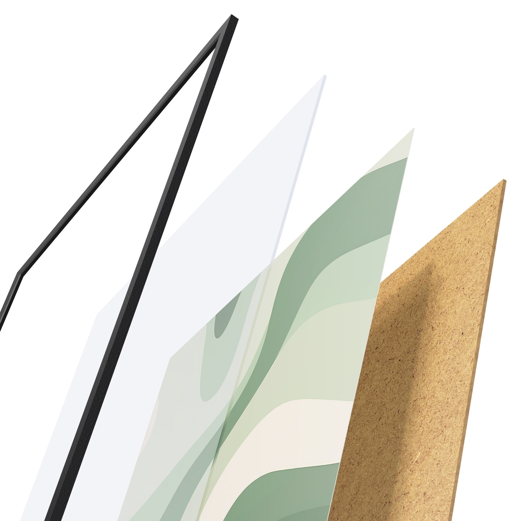 Das Poster besteht aus einem Rahmen, Plexiglas, einem gedruckten Bild und einer Rückwand aus Spanplatten. Dank der Halterungen auf der Rückseite kann das Poster sofort an die Wand gehängt werden.