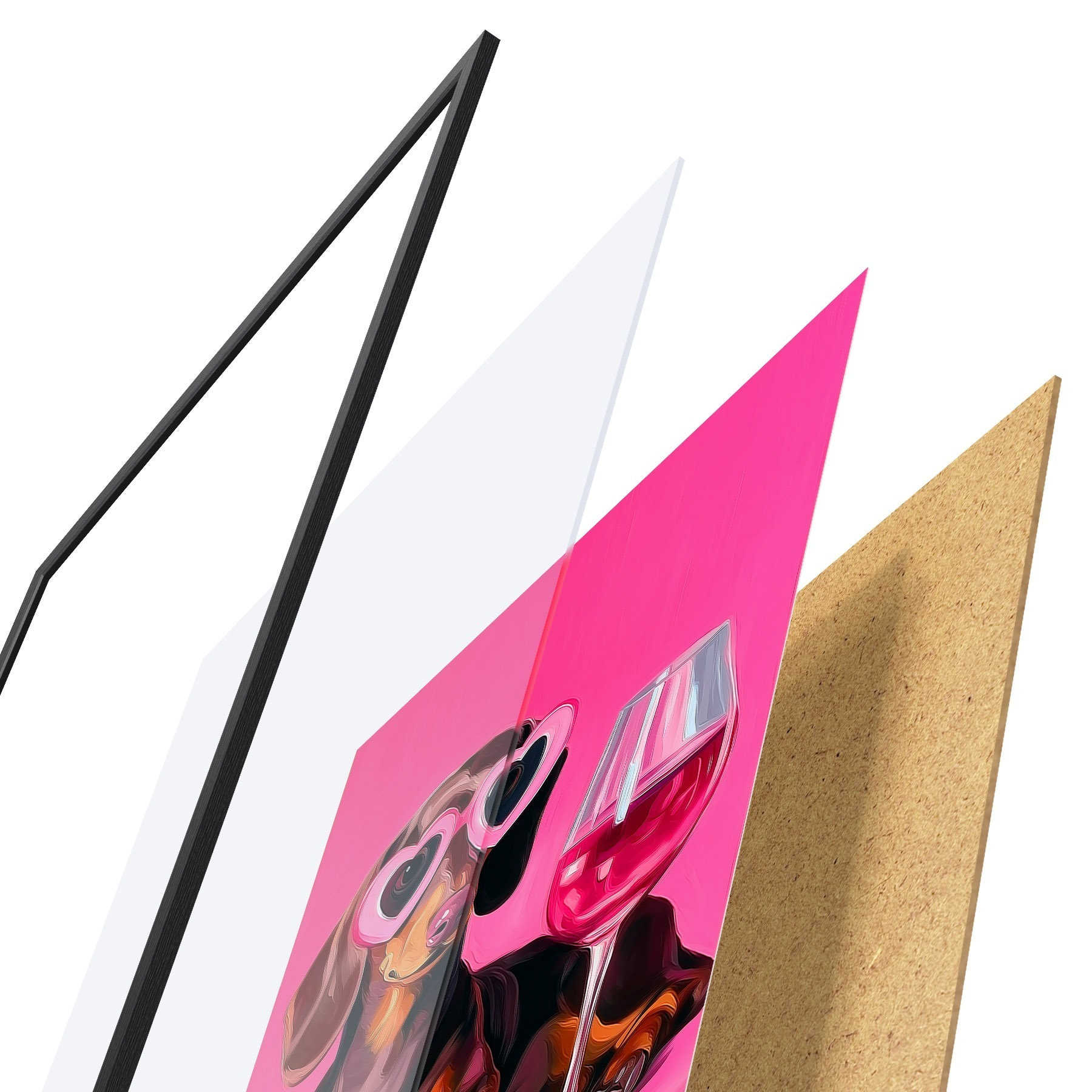 Das Poster besteht aus einem Rahmen, Plexiglas, einem gedruckten Bild und einer Rückwand aus Spanplatten. Dank der Halterungen auf der Rückseite kann das Poster sofort an die Wand gehängt werden.