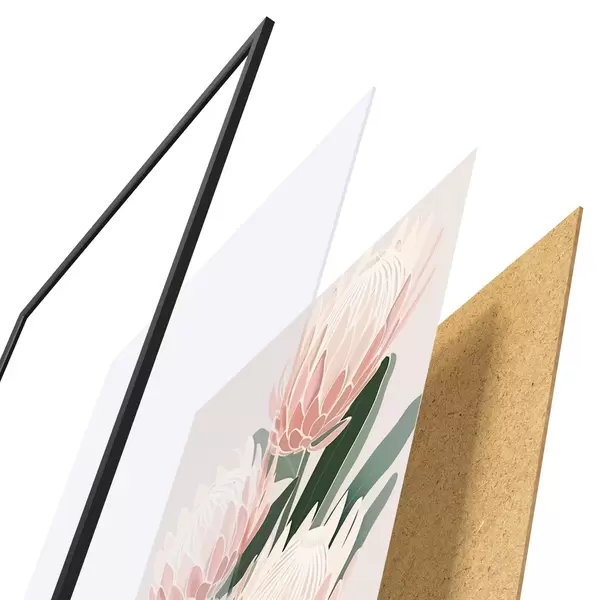 Das Poster besteht aus einem Rahmen, Plexiglas, einem gedruckten Bild und einer Rückwand aus Spanplatten. Dank der Halterungen auf der Rückseite kann das Poster sofort an die Wand gehängt werden.