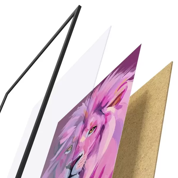 Das Poster besteht aus einem Rahmen, Plexiglas, einem gedruckten Bild und einer Rückwand aus Spanplatten. Dank der Halterungen auf der Rückseite kann das Poster sofort an die Wand gehängt werden.