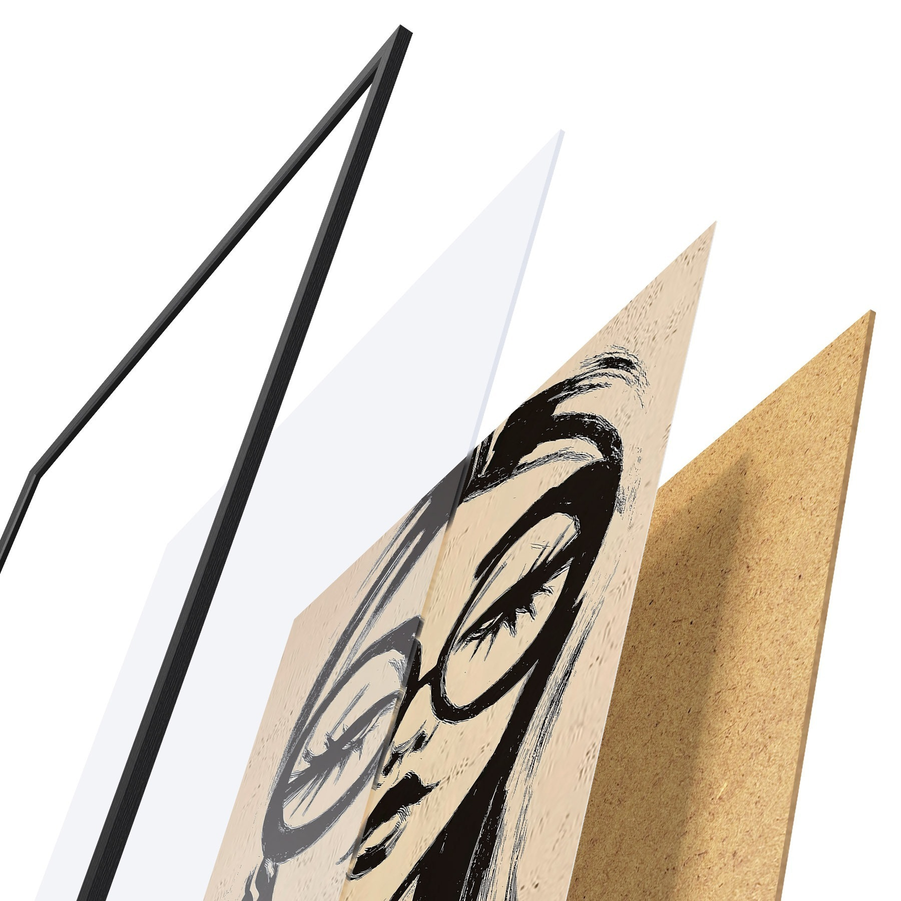 Das Poster besteht aus einem Rahmen, Plexiglas, einem gedruckten Bild und einer Rückwand aus Spanplatten. Dank der Halterungen auf der Rückseite kann das Poster sofort an die Wand gehängt werden.