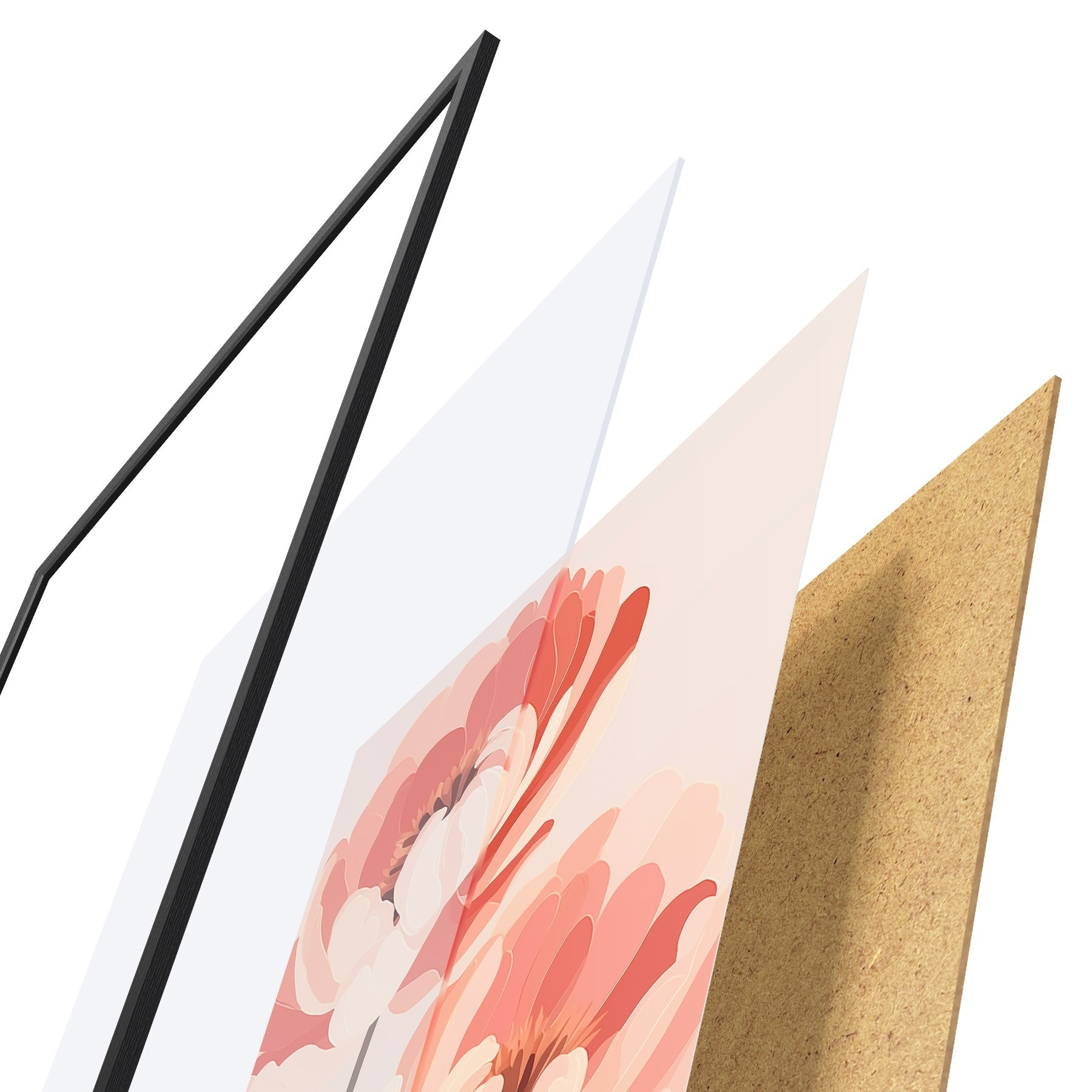 Das Poster besteht aus einem Rahmen, Plexiglas, einem gedruckten Bild und einer Rückwand aus Spanplatten. Dank der Halterungen auf der Rückseite kann das Poster sofort an die Wand gehängt werden.