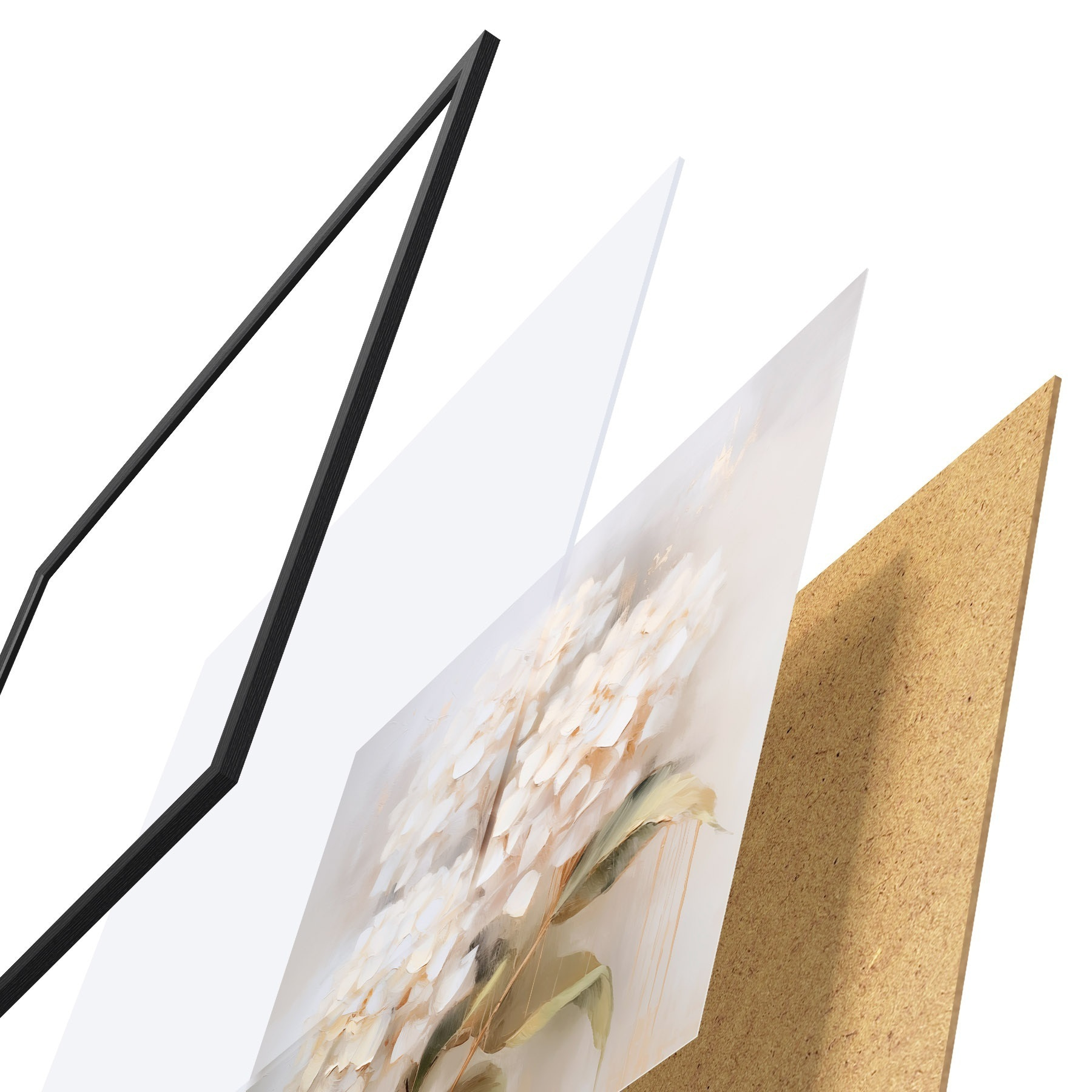 Das Poster besteht aus einem Rahmen, Plexiglas, einem gedruckten Bild und einer Rückwand aus Spanplatten. Dank der Halterungen auf der Rückseite kann das Poster sofort an die Wand gehängt werden.