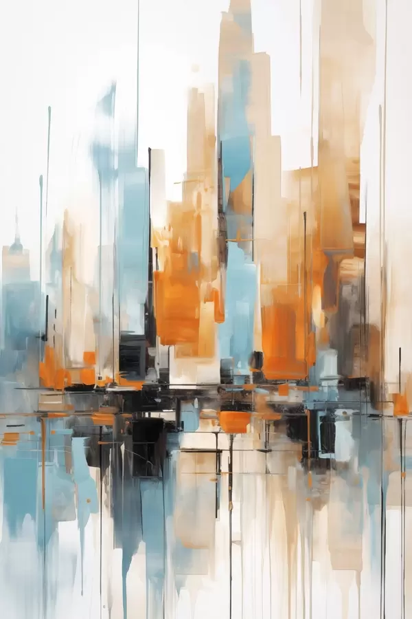 Poster Abstrakte Stadtlandschaft mit vertikalen Pinselstrichen in Orange-, Blau- und Weißtönen, Malstil Nr f46267