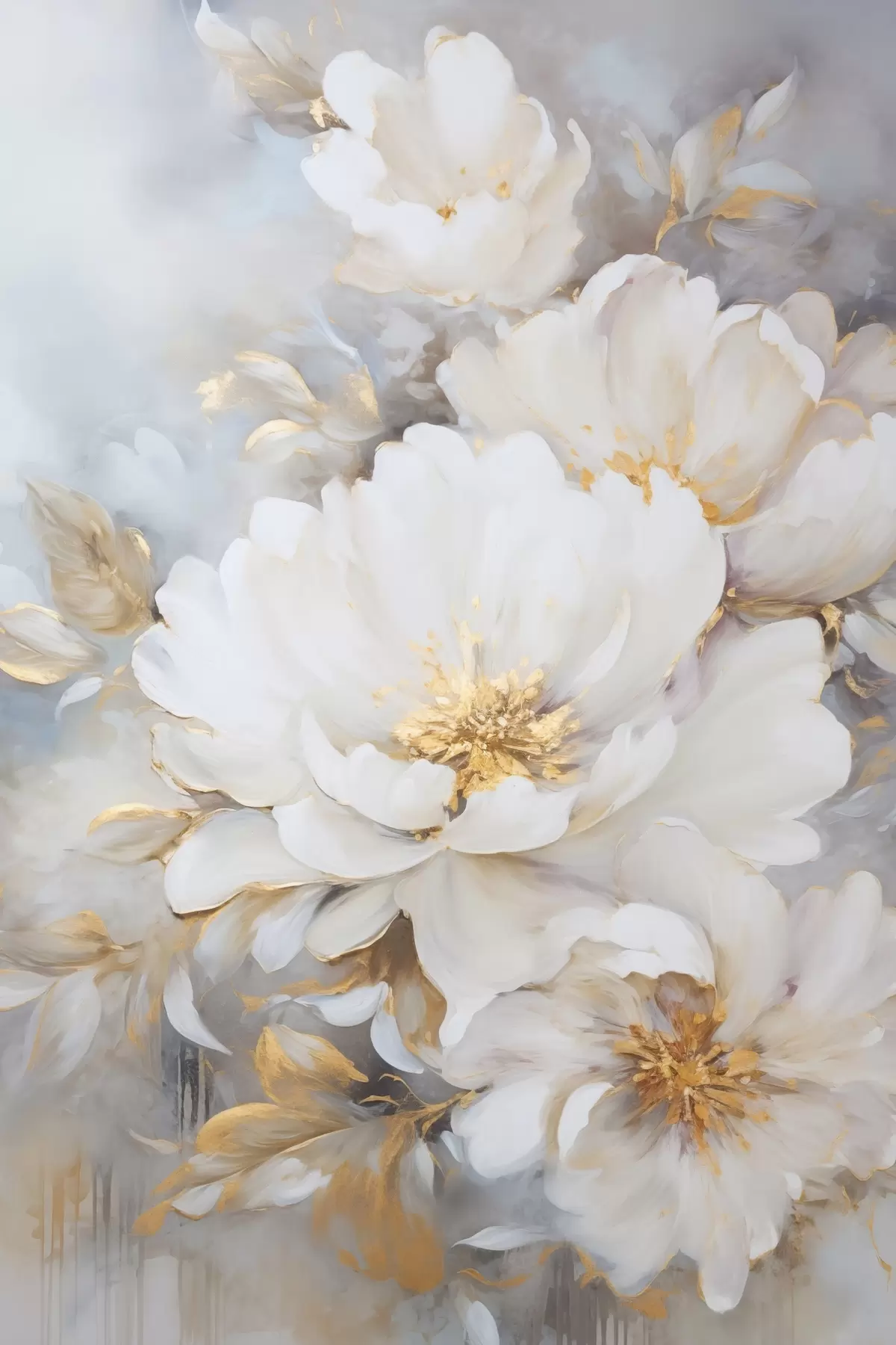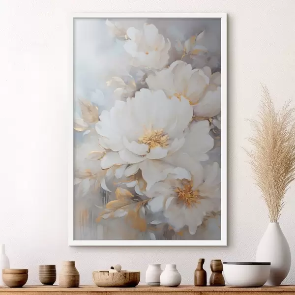 Poster Weiße Pfingstrosen mit blauen Blütenkernen und Blättern, sanfte Pinselstriche, hellblauer Hintergrund, Blumenarrangement Nr f46271