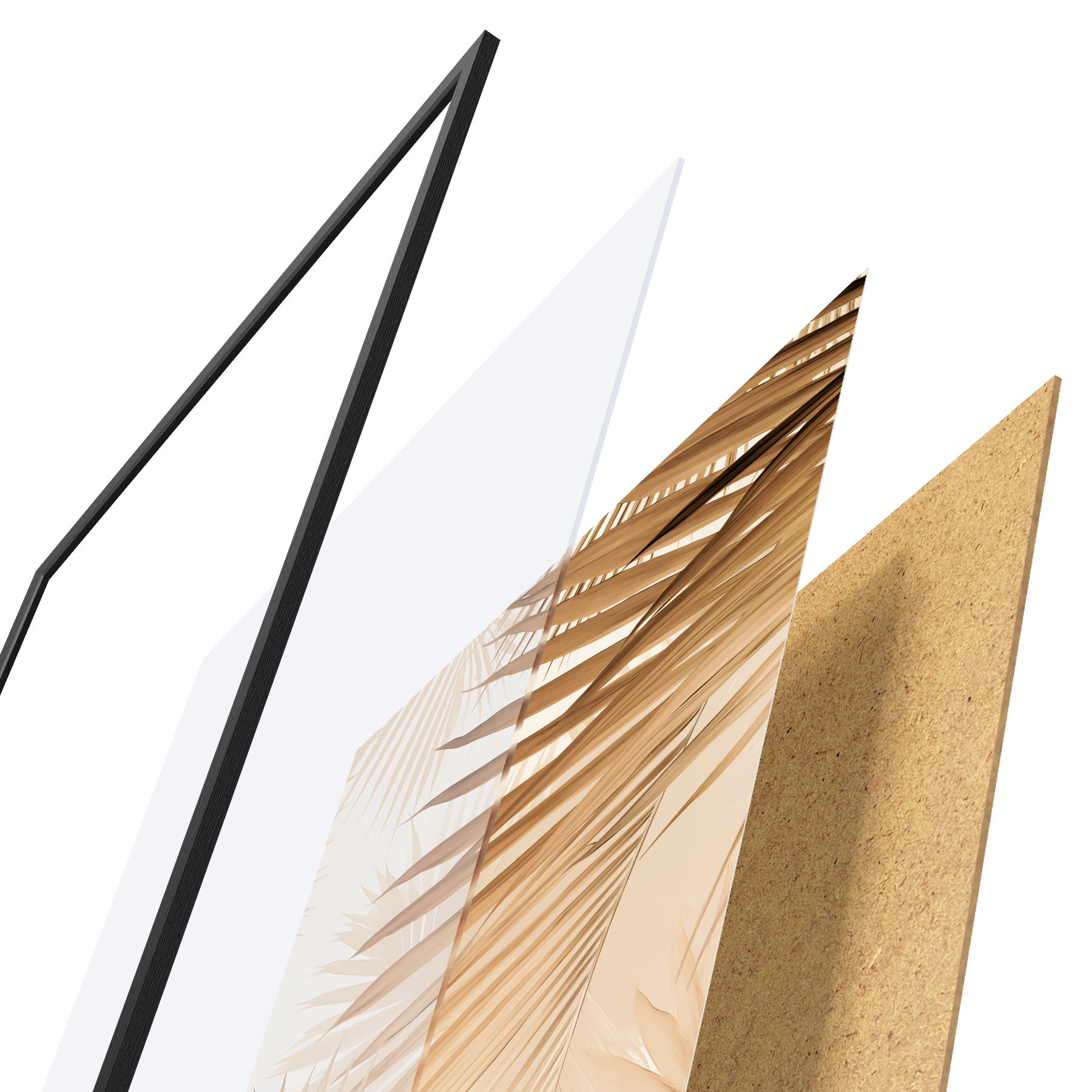 Das Poster besteht aus einem Rahmen, Plexiglas, einem gedruckten Bild und einer Rückwand aus Spanplatten. Dank der Halterungen auf der Rückseite kann das Poster sofort an die Wand gehängt werden.