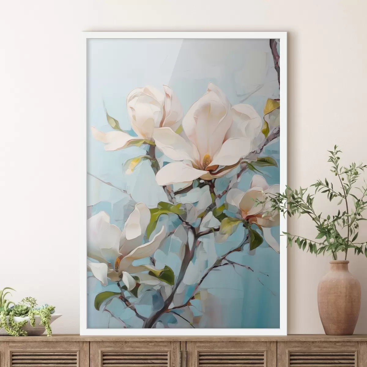 Poster Weiße Magnolienblüten, hellblauer Hintergrund mit sanften Pinselstrichen, Ölgemälde-Stil, pastose Textur Nr f46277