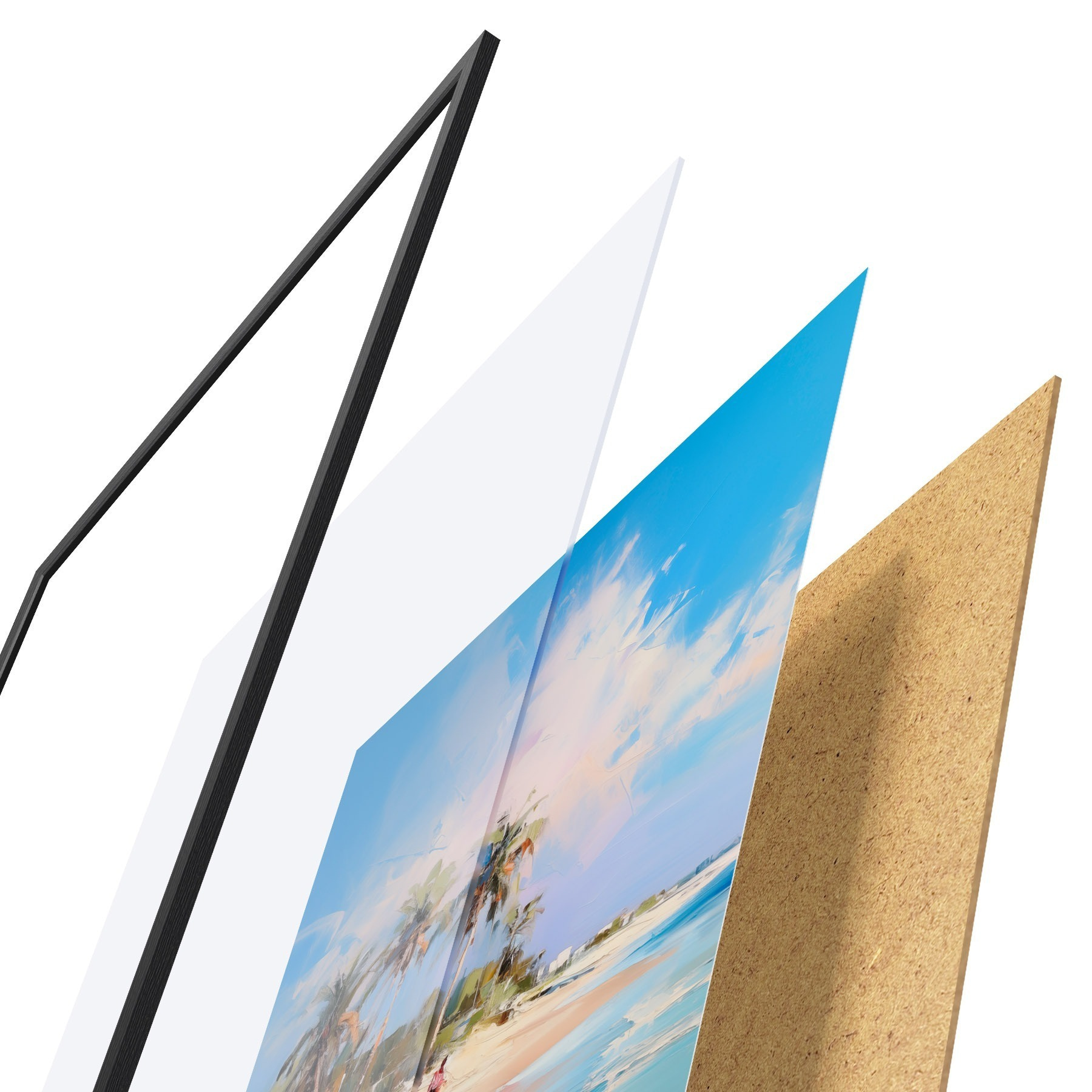 Das Poster besteht aus einem Rahmen, Plexiglas, einem gedruckten Bild und einer Rückwand aus Spanplatten. Dank der Halterungen auf der Rückseite kann das Poster sofort an die Wand gehängt werden.