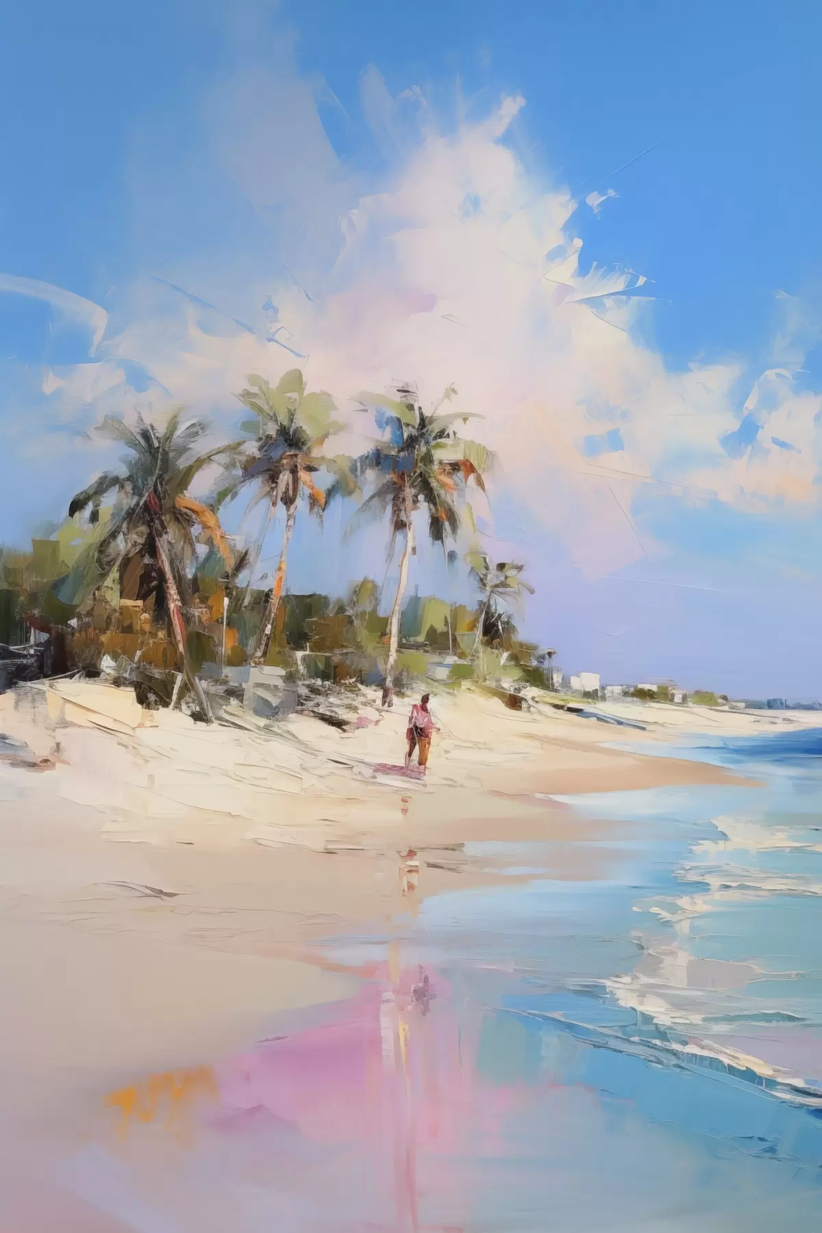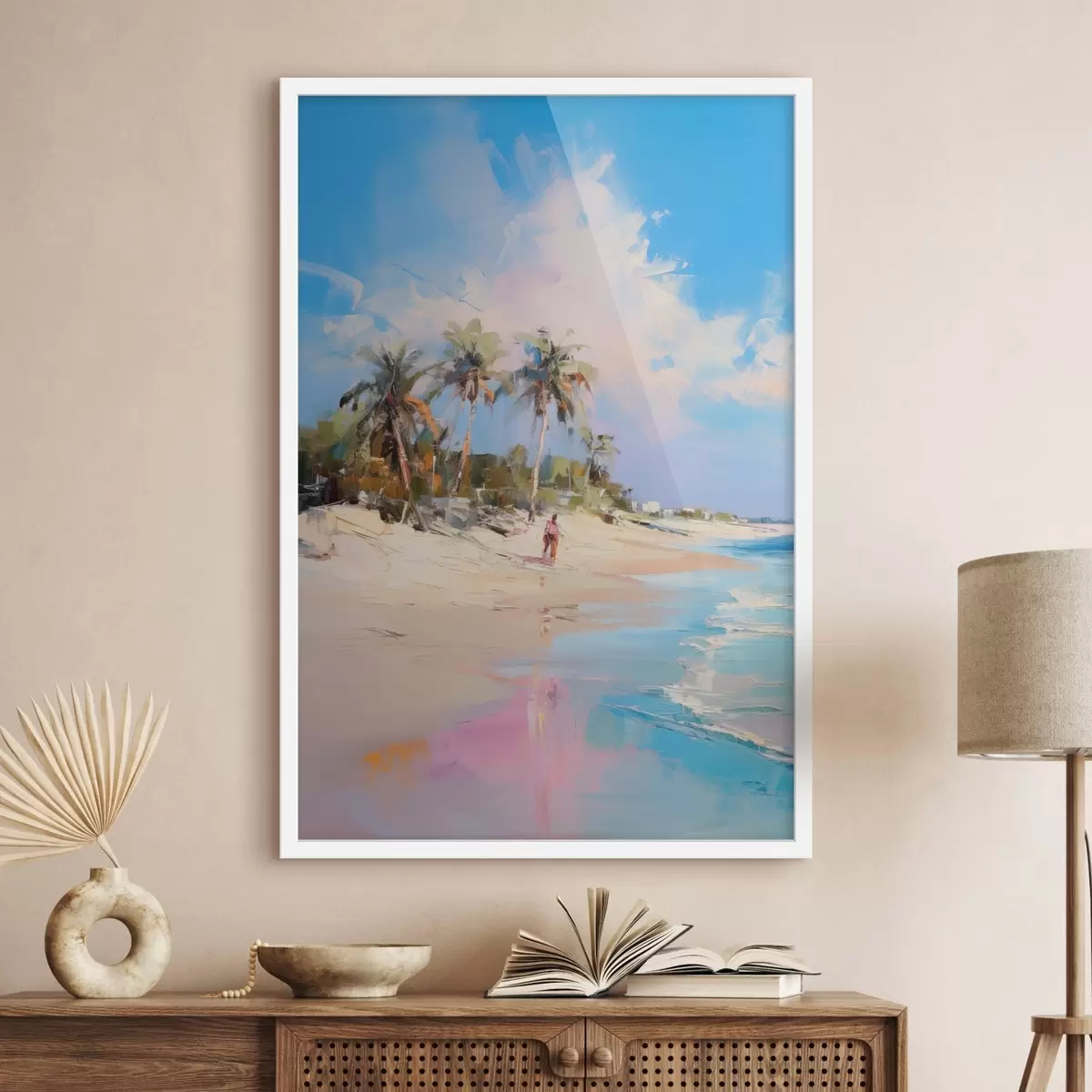Poster Abstrakte Landschaft, ein Strand mit Palmen, strahlender Sonnenschein mit blauem Himmel und einigen Wolken Nr f46284