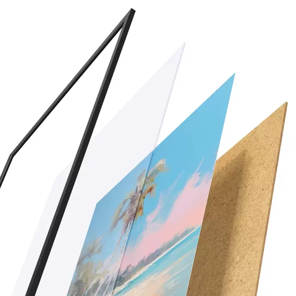 Das Poster besteht aus einem Rahmen, Plexiglas, einem gedruckten Bild und einer Rückwand aus Spanplatten. Dank der Halterungen auf der Rückseite kann das Poster sofort an die Wand gehängt werden.