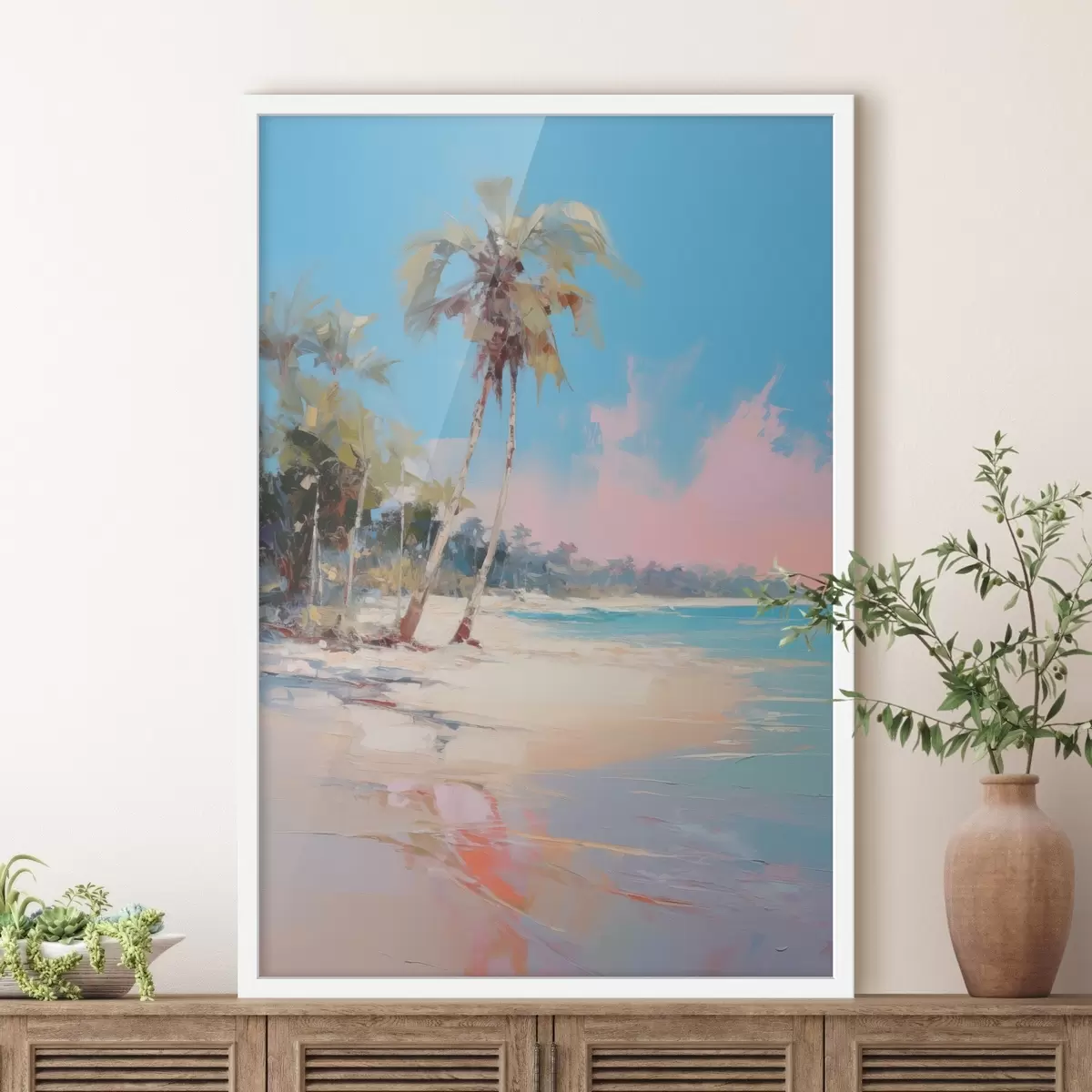 Poster Abstrakter tropischer Strand mit weißem Sand und Palmen, blauer Himmel mit weißen Wolken Nr f46285