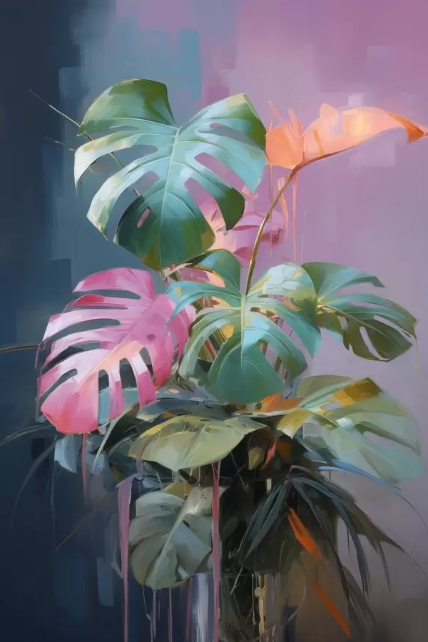 Poster Abstrakte Monstera-Pflanze mit rosa und grünen Blättern, leuchtenden Farben, vor einem unscharfen Hintergrund f46287