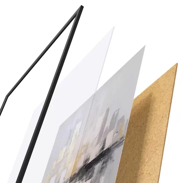Das Poster besteht aus einem Rahmen, Plexiglas, einem gedruckten Bild und einer Rückwand aus Spanplatten. Dank der Halterungen auf der Rückseite kann das Poster sofort an die Wand gehängt werden.