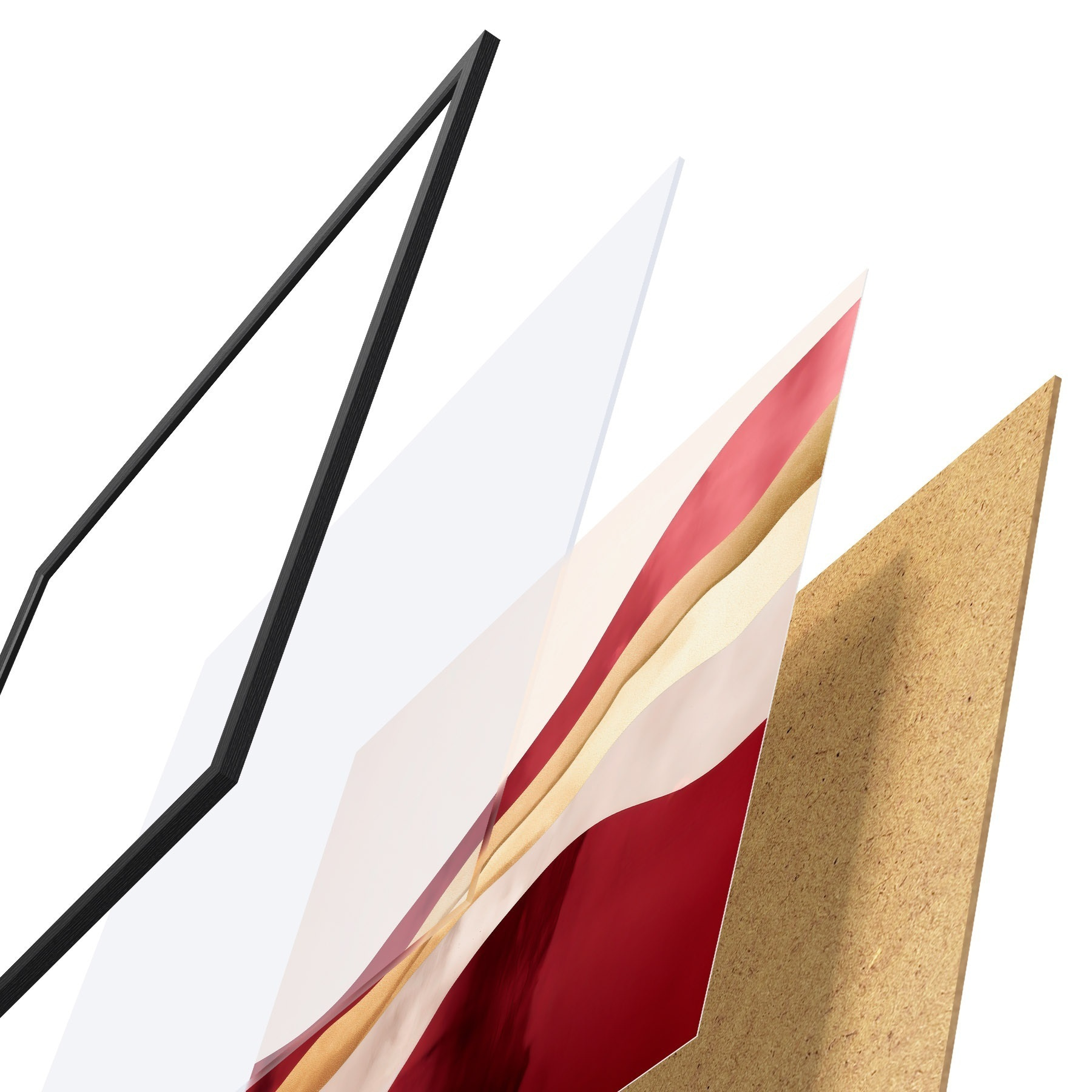 Das Poster besteht aus einem Rahmen, Plexiglas, einem gedruckten Bild und einer Rückwand aus Spanplatten. Dank der Halterungen auf der Rückseite kann das Poster sofort an die Wand gehängt werden.