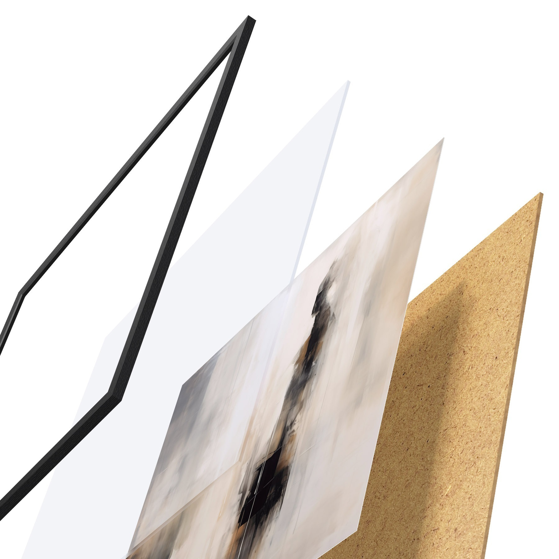 Das Poster besteht aus einem Rahmen, Plexiglas, einem gedruckten Bild und einer Rückwand aus Spanplatten. Dank der Halterungen auf der Rückseite kann das Poster sofort an die Wand gehängt werden.
