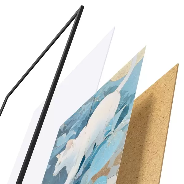 Das Poster besteht aus einem Rahmen, Plexiglas, einem gedruckten Bild und einer Rückwand aus Spanplatten. Dank der Halterungen auf der Rückseite kann das Poster sofort an die Wand gehängt werden.